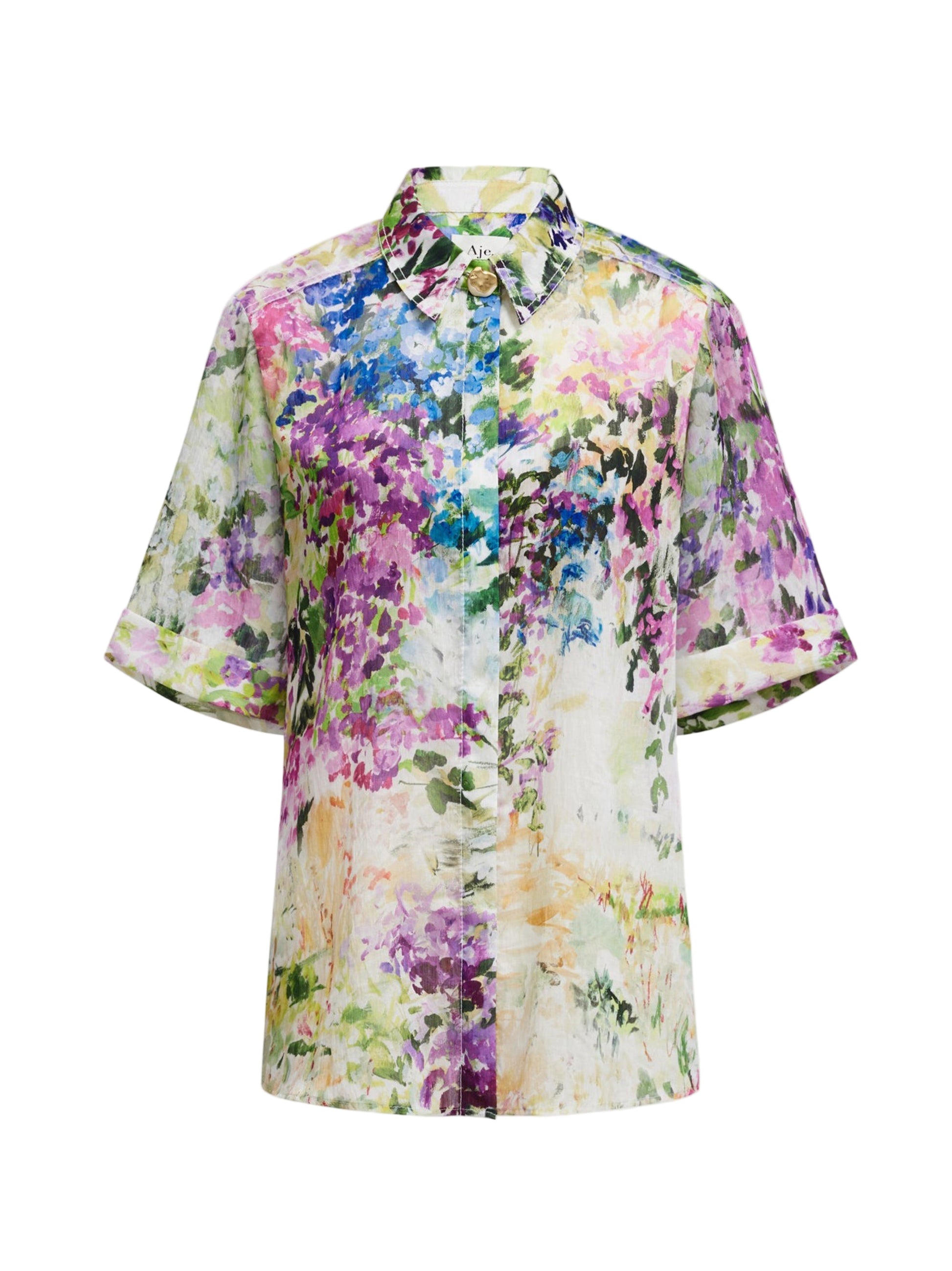 The Aje Adina Shirt in Lavandula combines effortless elegance with thoughtful design details. This relaxed-fit women's shirt features a classic shirt collar accented with a distinctive feature button, while the wide half sleeves with finished cuffs add contemporary flair. The generous silhouette offers comfortable all-day wear, making it an ideal layering piece or standalone statement. Perfect for creating polished, versatile looks that transition seamlessly from day to evening.