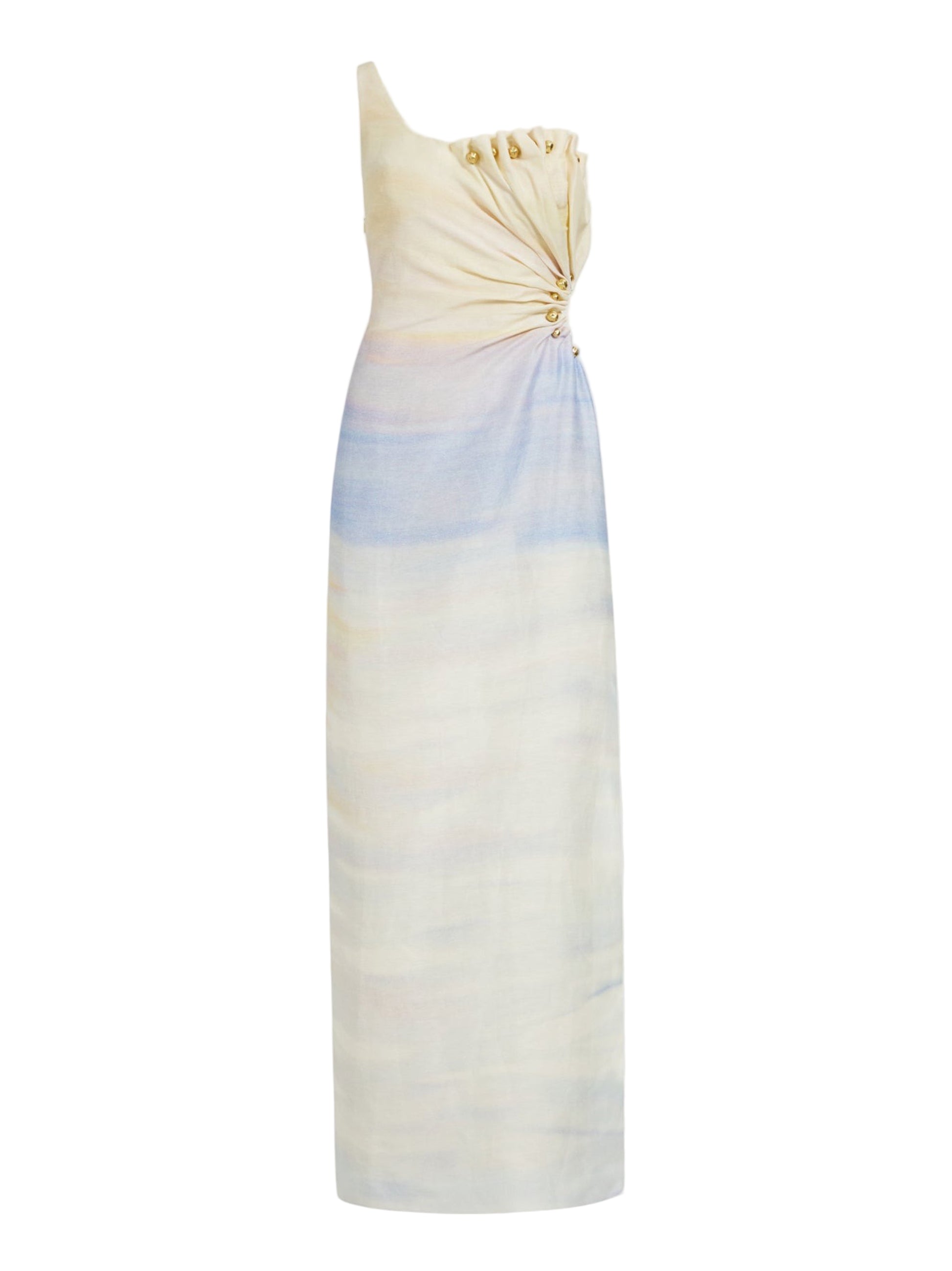 The Aje Avalon Maxi Dress in Horizon showcases sophisticated asymmetric design with a striking one-shoulder silhouette and floor-length slit. An internal bodice provides structured support, while the signature pinch fold neckline features delicate bead embellishment for refined elegance. A strategic side waist cutout, also adorned with beading, adds modern dimension to this statement piece. Perfect for evening events or upscale occasions where architectural tailoring and understated luxury make an impression.