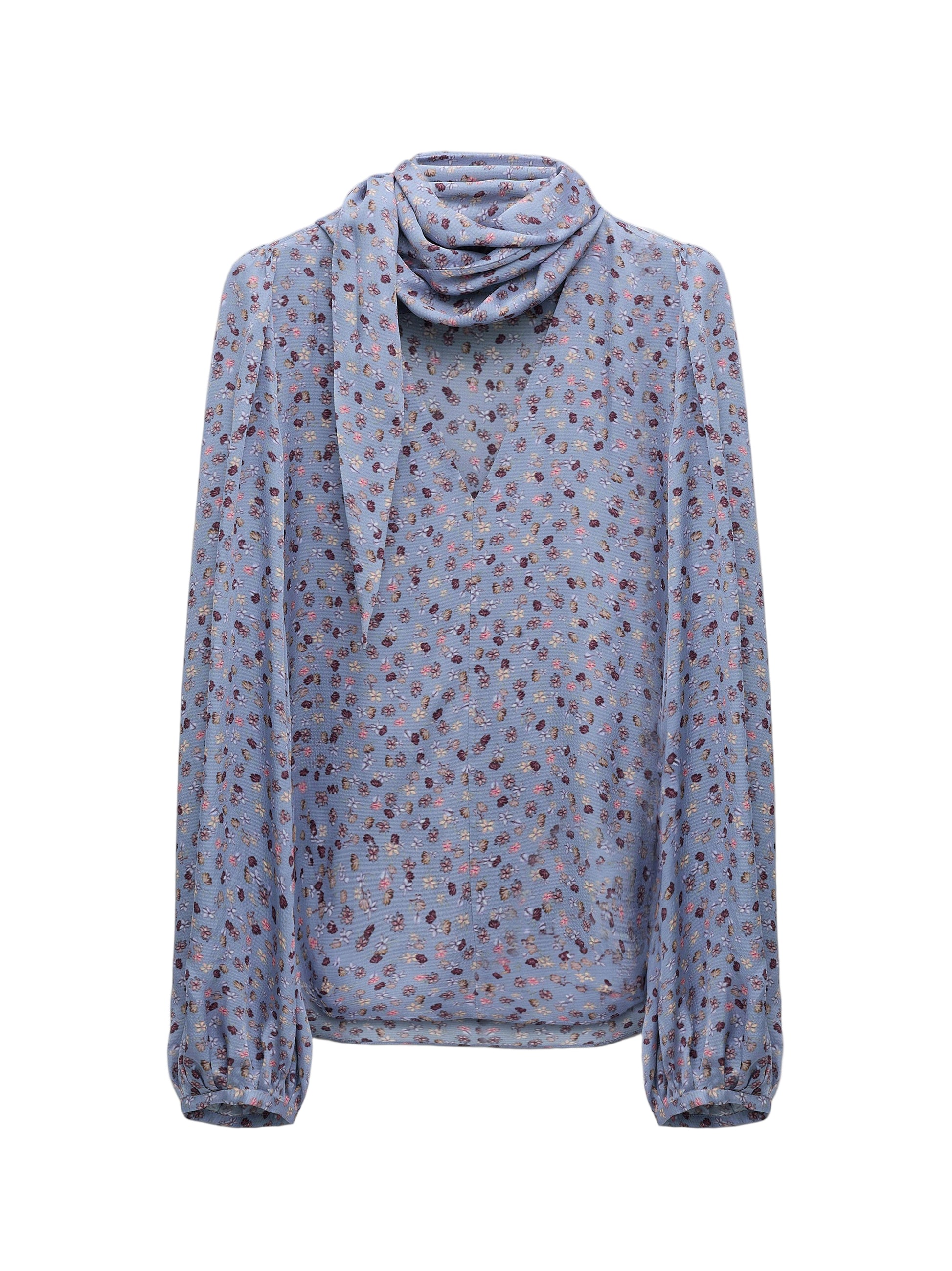 Crafted from luxurious hammered silk, this blouse features a delicate ditsy print in baby blossom blue. Its elegant V-neckline is complemented by a wrap-around tie collar, offering versatile styling options. The puff sleeves add volume and end in gathered cuffs, creating a refined silhouette with subtle texture. Perfect for sophisticated layering or wearing alone, this blouse balances feminine details with expert tailoring.