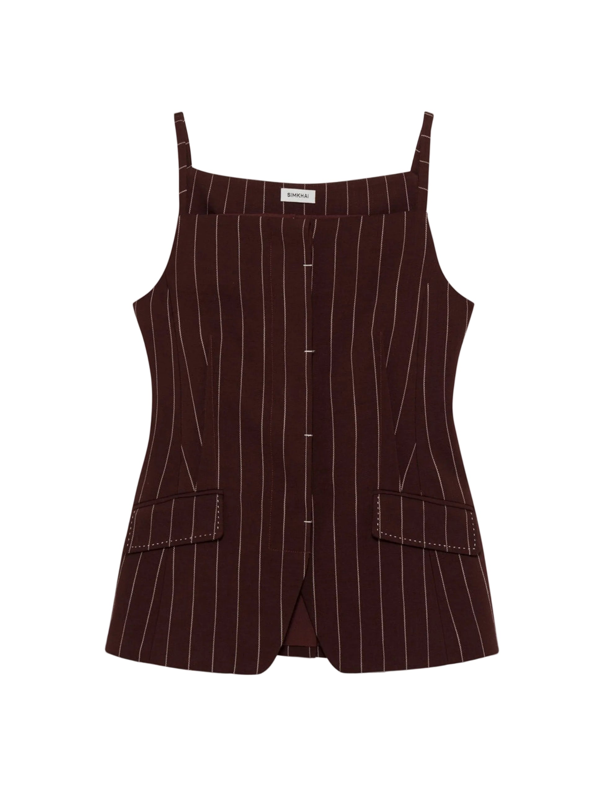 Crafted from fine pinstripe suiting, this Simkhai top delivers tailored sophistication with precision seaming and a sculpted waist that flatters the silhouette. The squared neckline introduces contemporary refinement, while structured flap pockets balance form with function. A versatile piece that transitions seamlessly from boardroom to evening occasions.