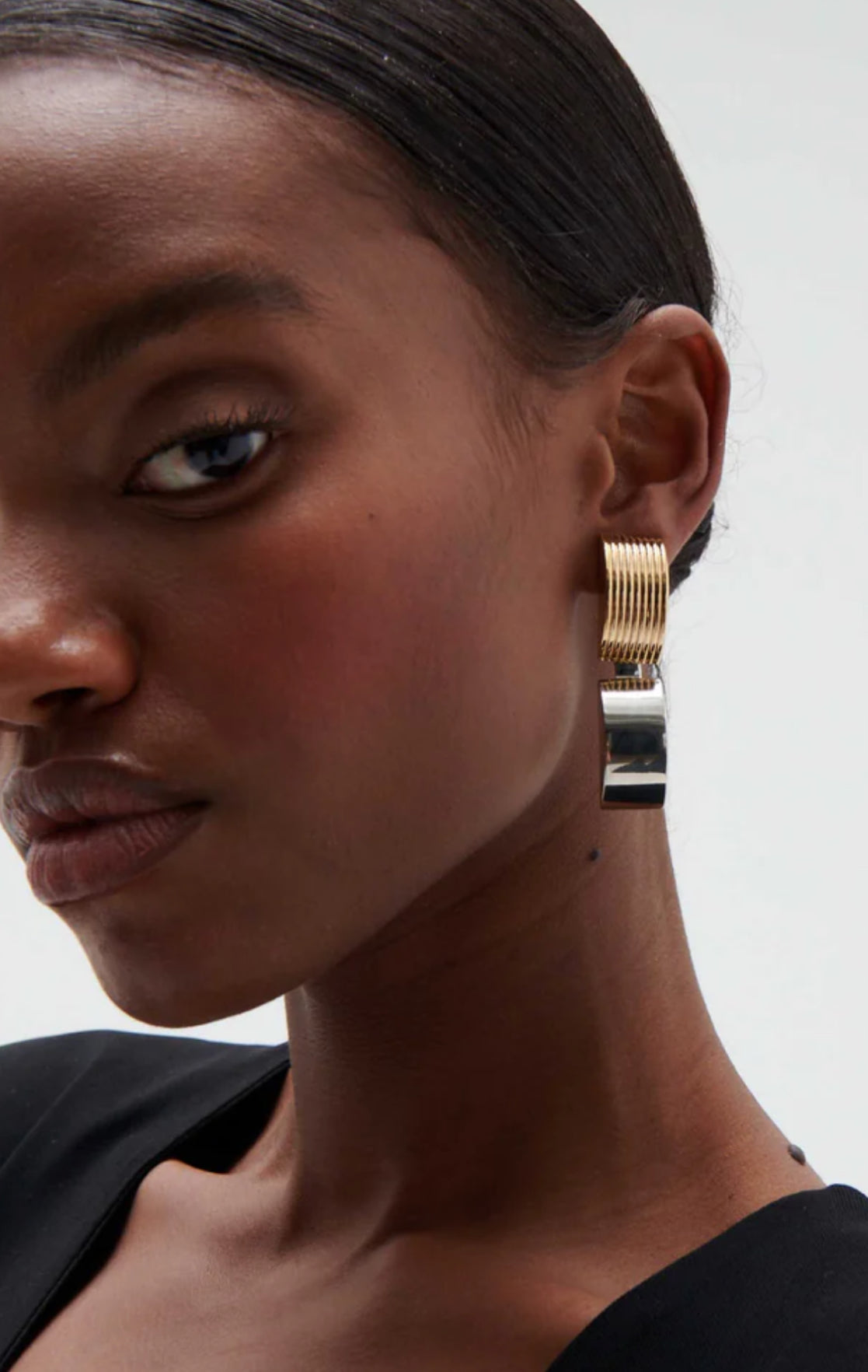 Introducing Demarson's Everly Earrings - the perfect blend of versatility and style. With a removable bottom piece, these earrings can be worn as a drop earring or a larger geometric stud. The gold ribbing detail adds texture, making these earrings a must-have for any occasion.