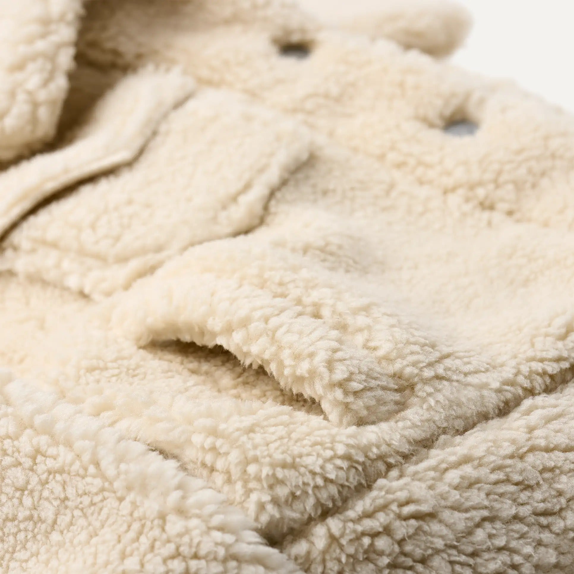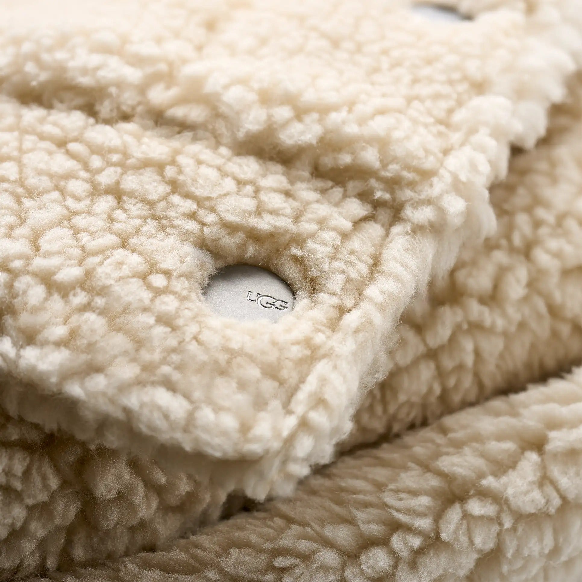 The UGG Frankie Short Trucker Jacket in Natural combines the signature comfort of UGG® with a classic utilitarian design. Crafted from ultra-soft plush fleece, its slightly cropped silhouette allows for versatile layering. The interior features a smooth Sun Logo Shape lining that adds a refined touch while enhancing wearability. This jacket offers both warmth and style, making it an ideal choice for transitional seasons or casual outdoor looks.
