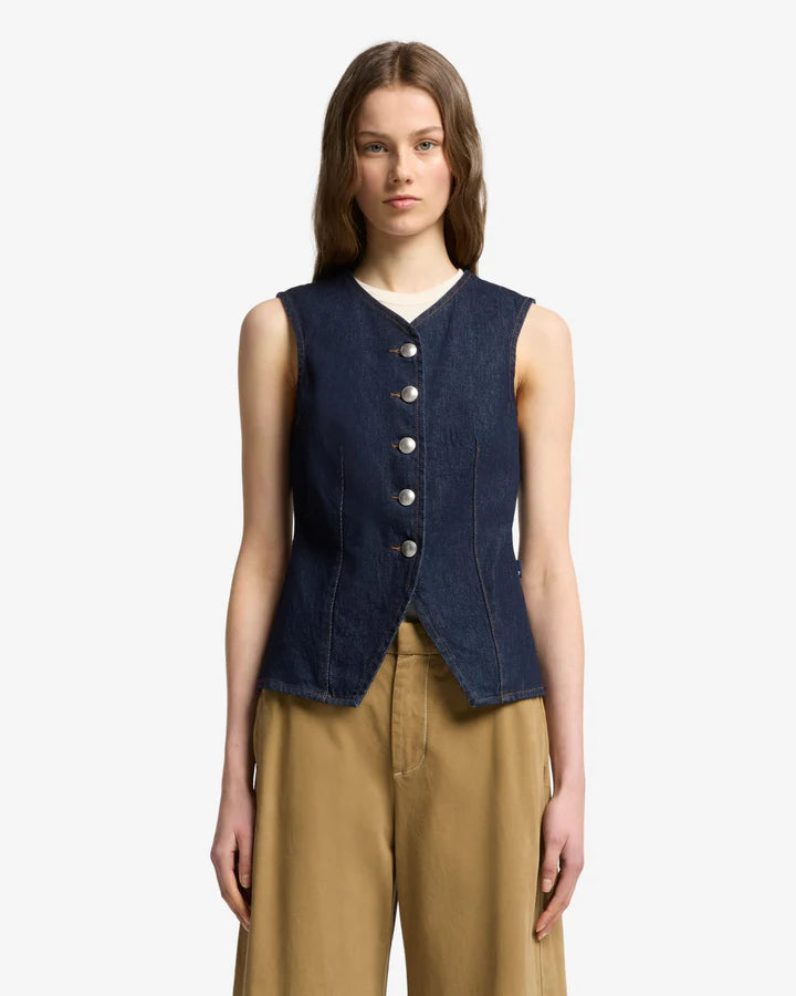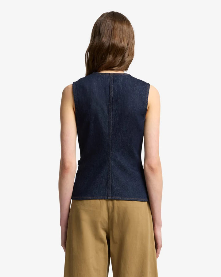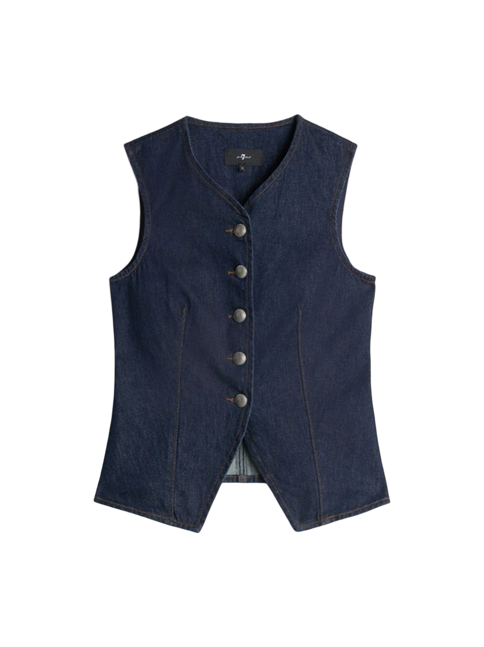 Discover the sleek and modern style of our Lady Vest from 7 For All Mankind. Tailored to contour to your body, this vneck vest offers a flattering silhouette. Made from rigid denim, it will maintain its shape while becoming softer over time. Perfect for a polished and lived-in look.