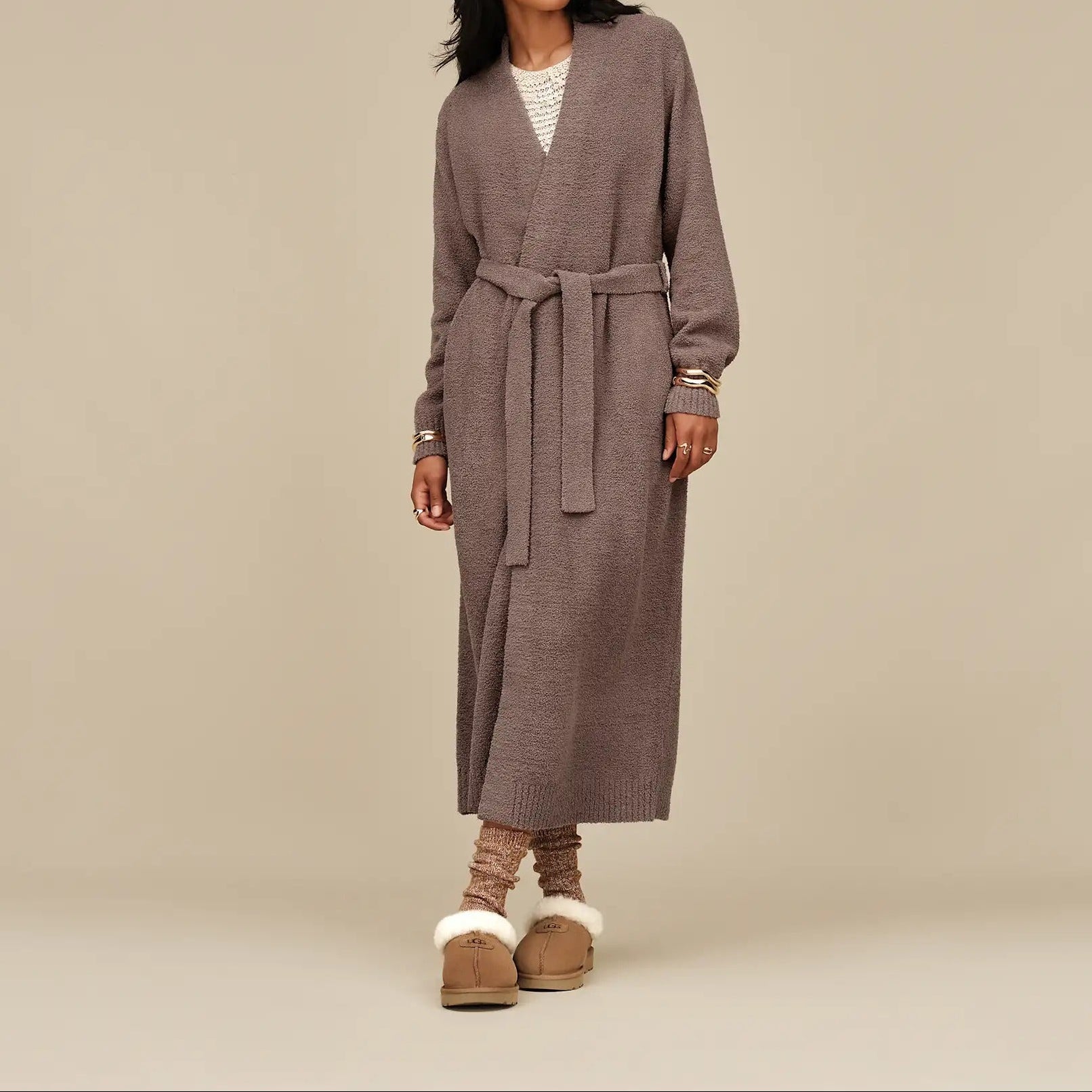 Crafted from 100% recycled fibers, the UGG Lenny Robe II offers exceptional softness and a distinctive textured feel for comfortable relaxation at home. Designed with practical side-seam pockets and an adjustable self-belt, it ensures both convenience and a tailored fit. This robe complements your loungewear collection effortlessly, especially when paired with your favorite slippers, making it an expert choice for cozy, sustainable comfort.