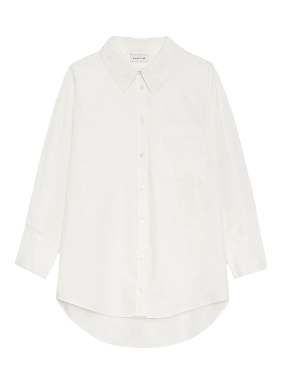 Expertly crafted from our signature 100% cotton-poplin, the Anine Bing Mika Shirt in White offers a crisp and structured look. With added features like dropped shoulder seams and back pleats, this oversized shirt provides a flattering silhouette. Its exaggerated shirttail hem and double-button detailing at the cuffs give it a touch of sophistication.
