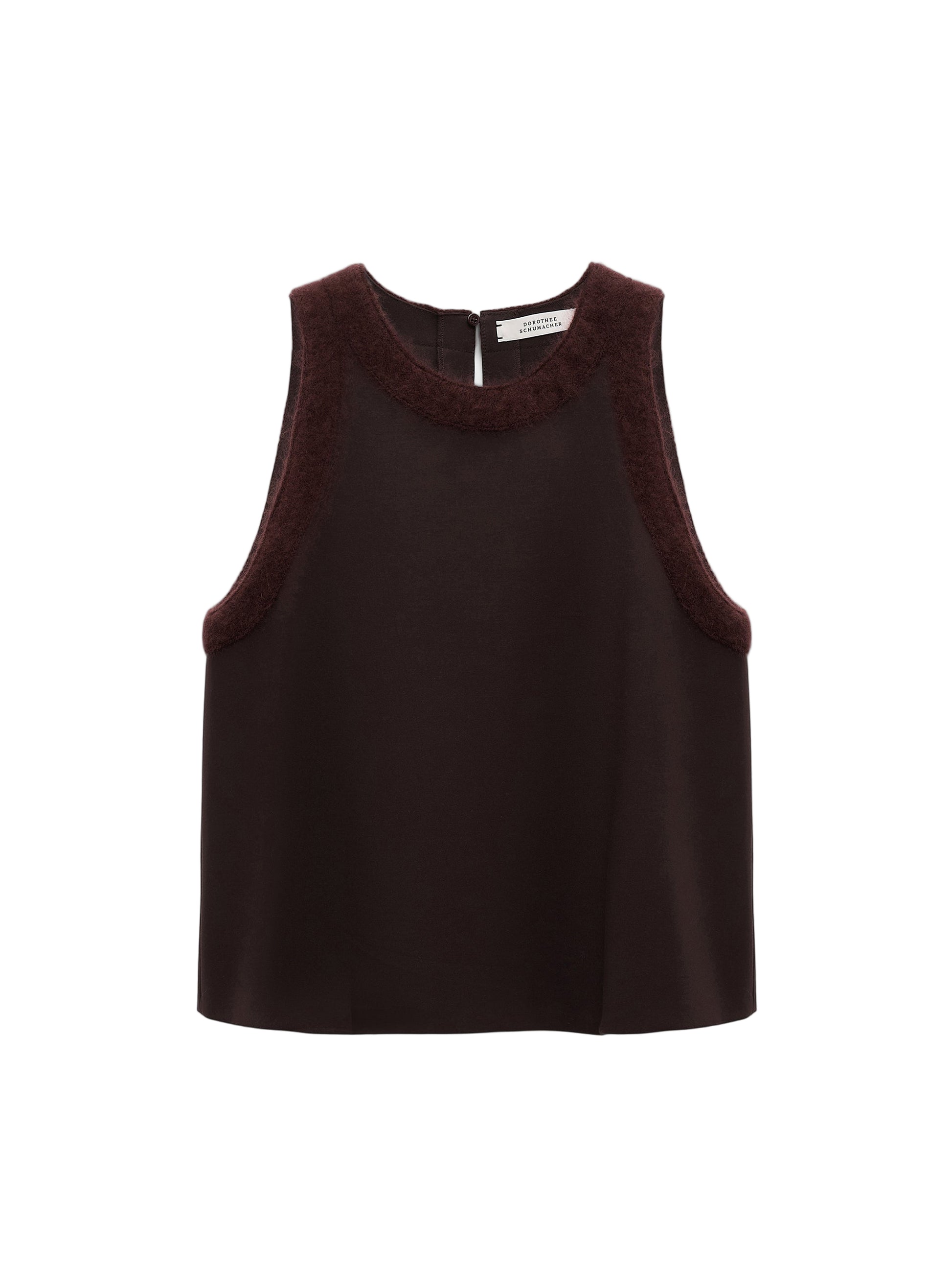 Crafted from our beloved Punto Milano fabric, this shell top features a refined dark chocolate hue and tonal fluffy knit trim that adds subtle texture. The shell’s slight A-line silhouette ensures a flattering fit, while the slit and button closure at the nape provides an elegant finishing detail, perfect for layering or wearing on its own.