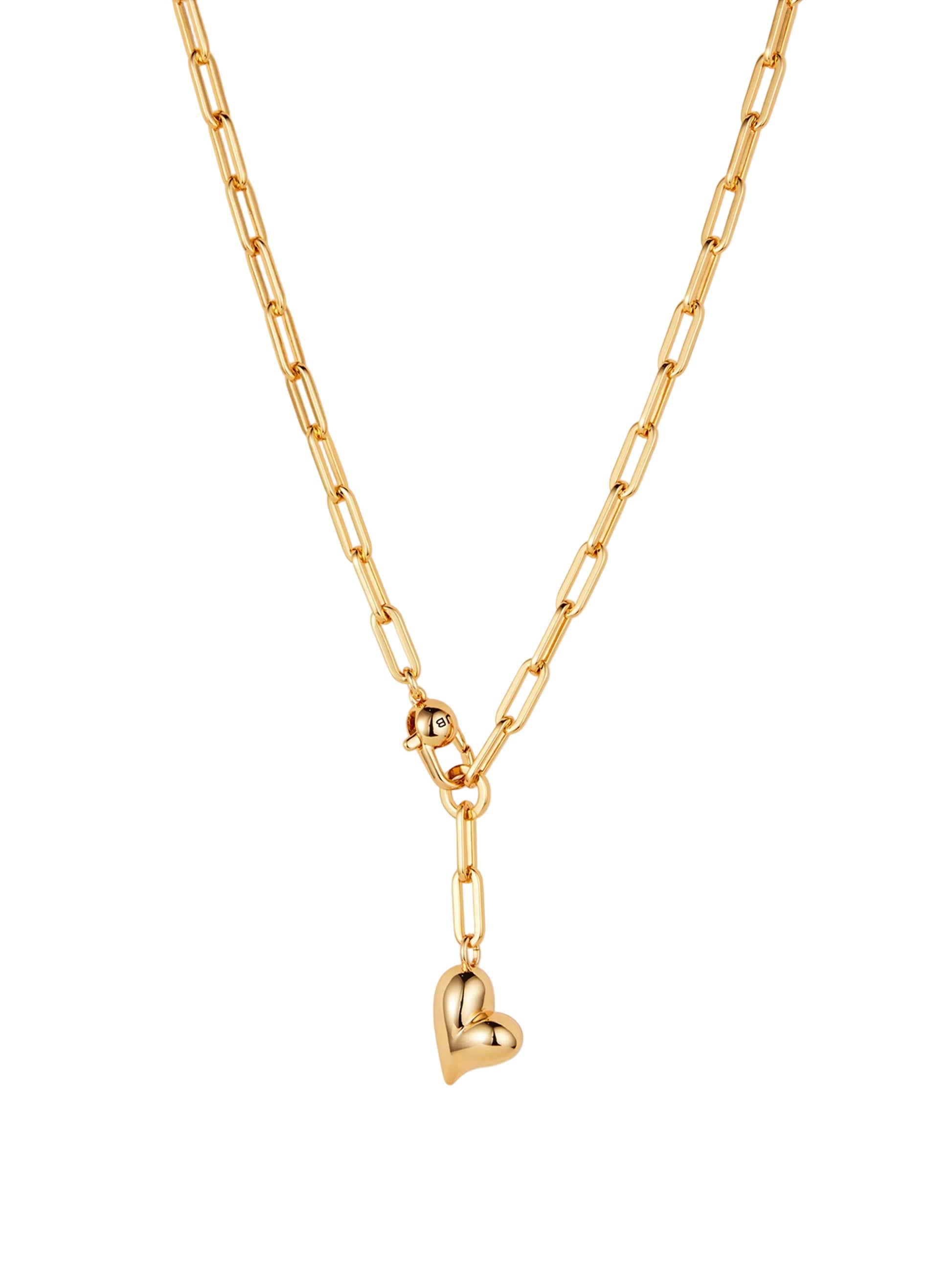 The Jenny Bird Puffy Heart Necklace features a distinctive, inflated heart design, elegantly suspended from a high-polish gold paperclip link chain. This piece combines contemporary aesthetics with durable materials, providing an eye-catching accessory suitable for various occasions. Its versatile style enhances outfits while adding a modern artistic touch.