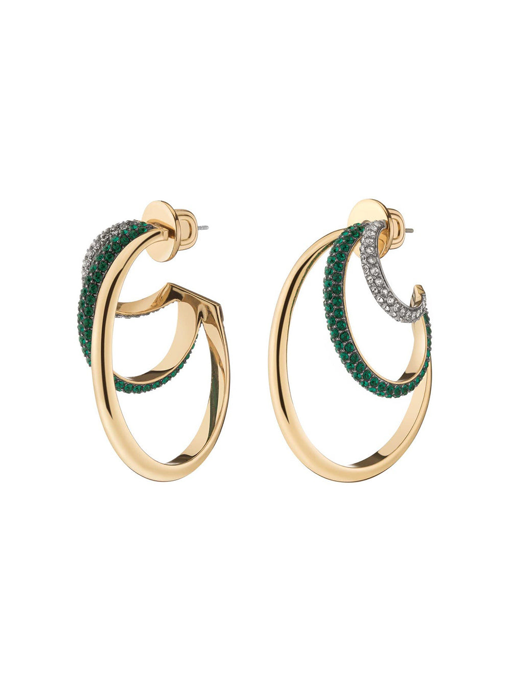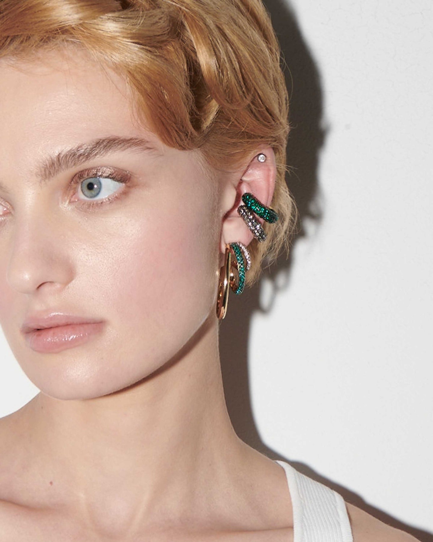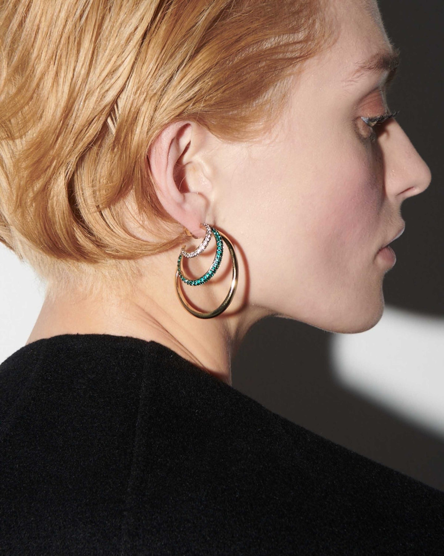 Introducing Demarson Raisa Hoop Earrings in Gold/Emerald - the perfect accessory for hoop lovers. These tri-hoop earrings add a touch of sparkle and edge to any outfit. Elevate your style with these three tiers of elegance.