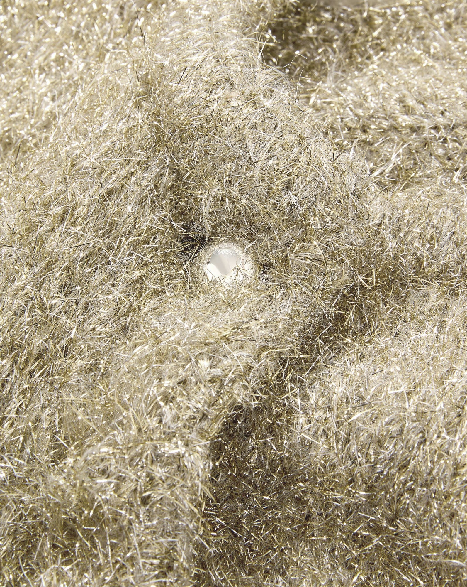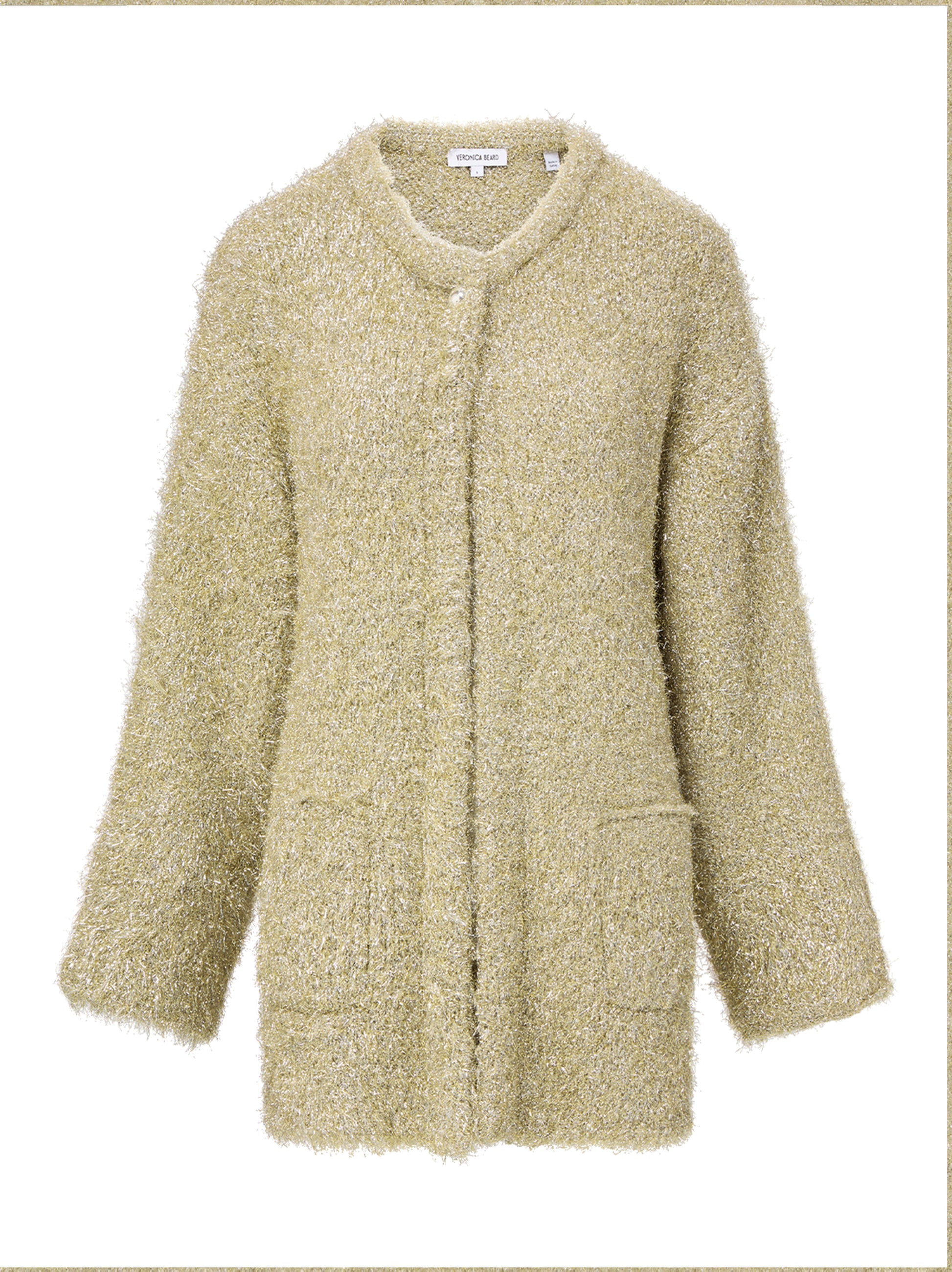 The Veronica Beard Rozan Knit Jacket in Gold combines luxury and comfort through its gold Italian eyelash yarn, offering a warm, soft texture with a subtle metallic sheen. Designed with an oversized, boxy silhouette, dropped shoulders, and widened sleeves, this jacket delivers a modern, effortless style. Its collarless, single-button neckline and concealed closures create a sleek front, complemented by a practical patch pocket. Falling at the upper thigh, it layers beautifully over jeans and boots for a polished yet relaxed look that stands out with sophisticated shine.