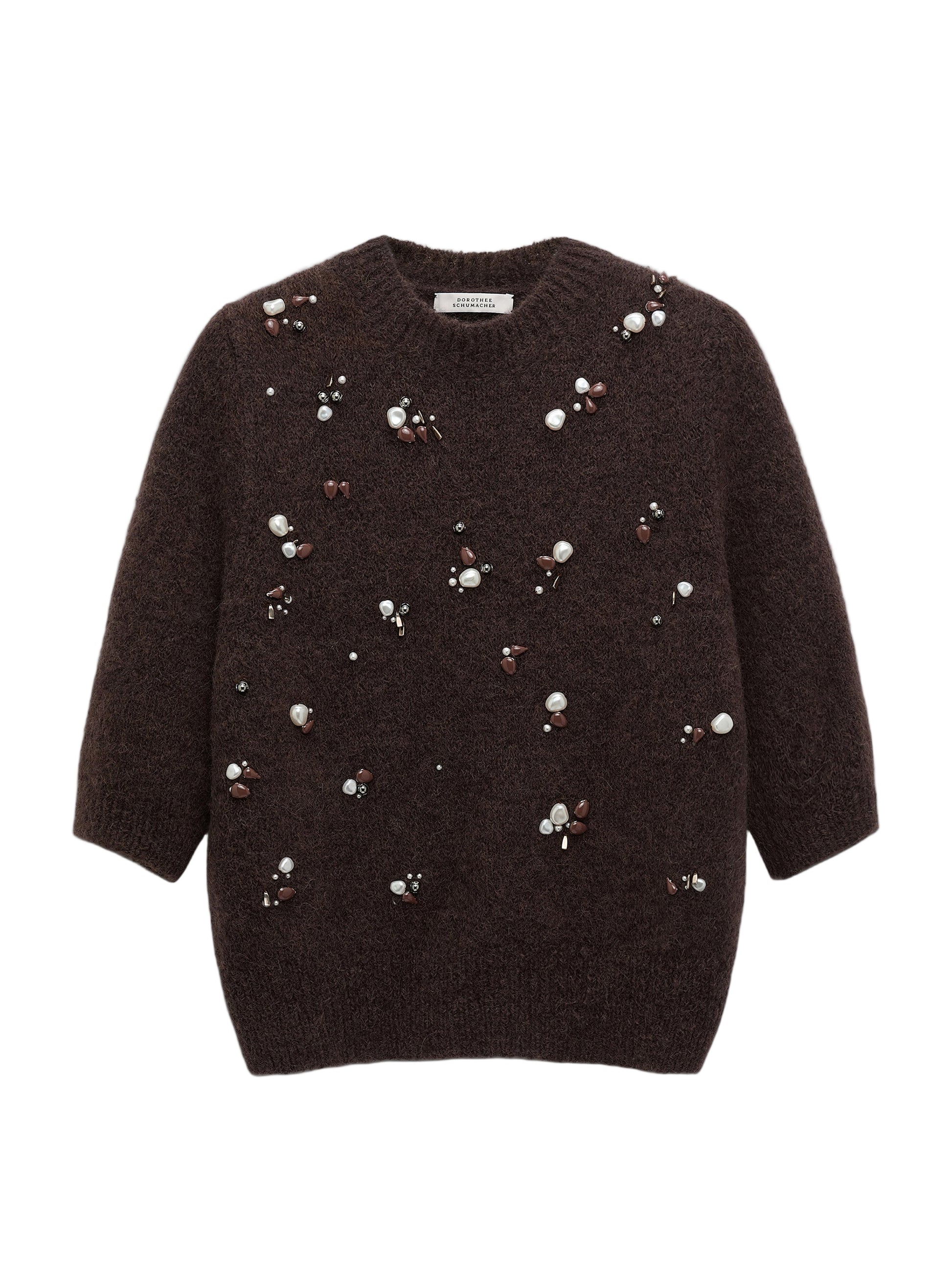 This dark chocolate cropped sleeve sweater from Dorothee Schumacher combines sophisticated design with subtle luxury. Featuring ribbed hems for a refined finish, it is delicately embellished with stone details that add an understated sparkle. Perfect for elevated casual looks, this piece offers a tailored silhouette that enhances your outfit with both texture and elegance.