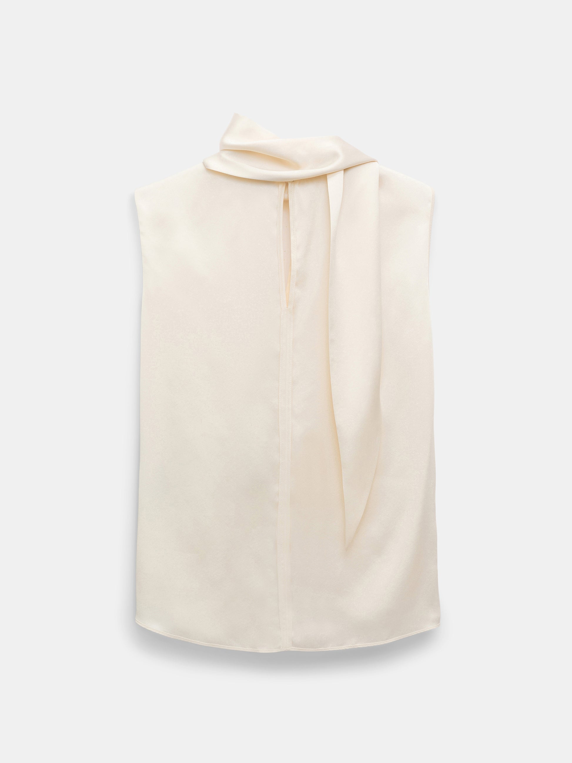 This sleeveless blouse crafted from luxurious silk satin features a refined scarf collar, offering a sophisticated silhouette. Its smooth texture and elegant sheen make it ideal for both professional and formal occasions. Designed to coordinate seamlessly with the bias-cut skirt, it creates a polished, cohesive ensemble.