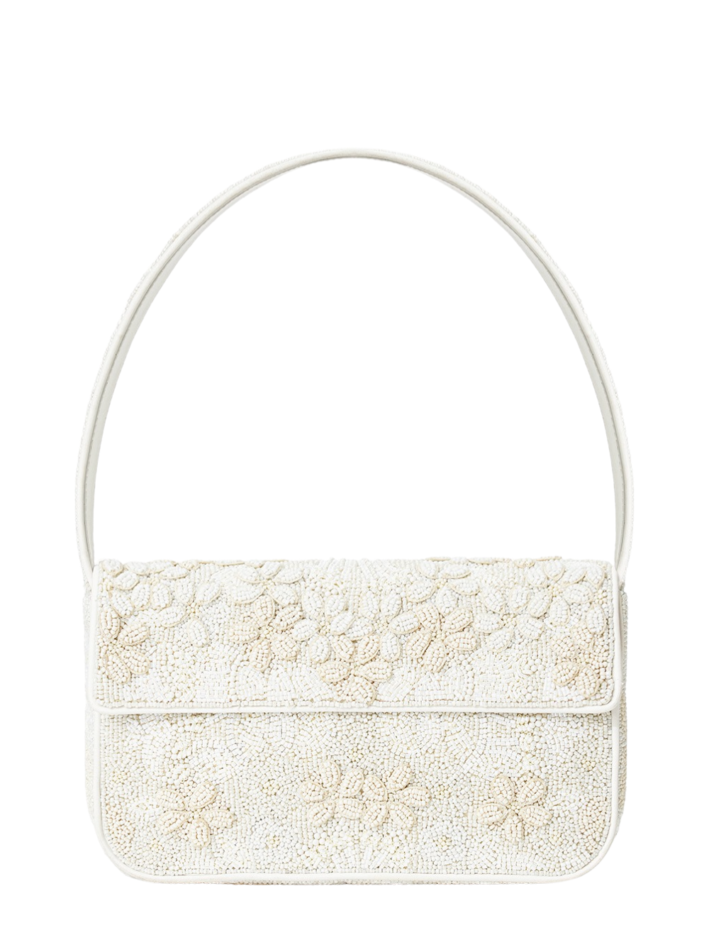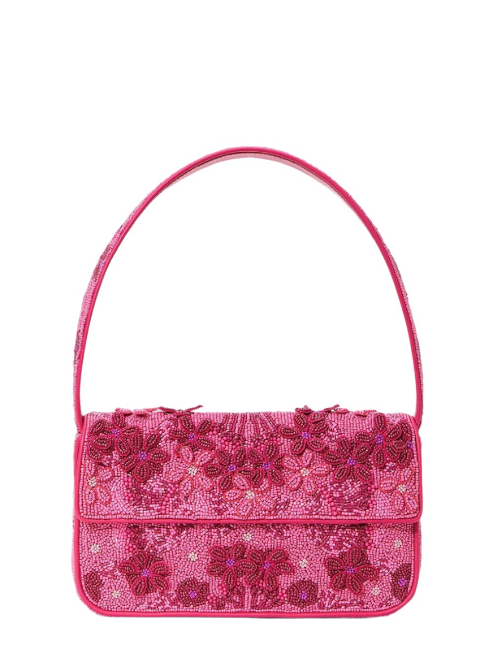 Introducing the Staud Tommy Bag, your new go-to shoulder bag. Made with hand-beaded details and vegan leather piping, this updated version showcases 3D flower embellishments and a convenient magnetic snap closure. Elevate your style and stay organized with this classic yet trendy bag.
