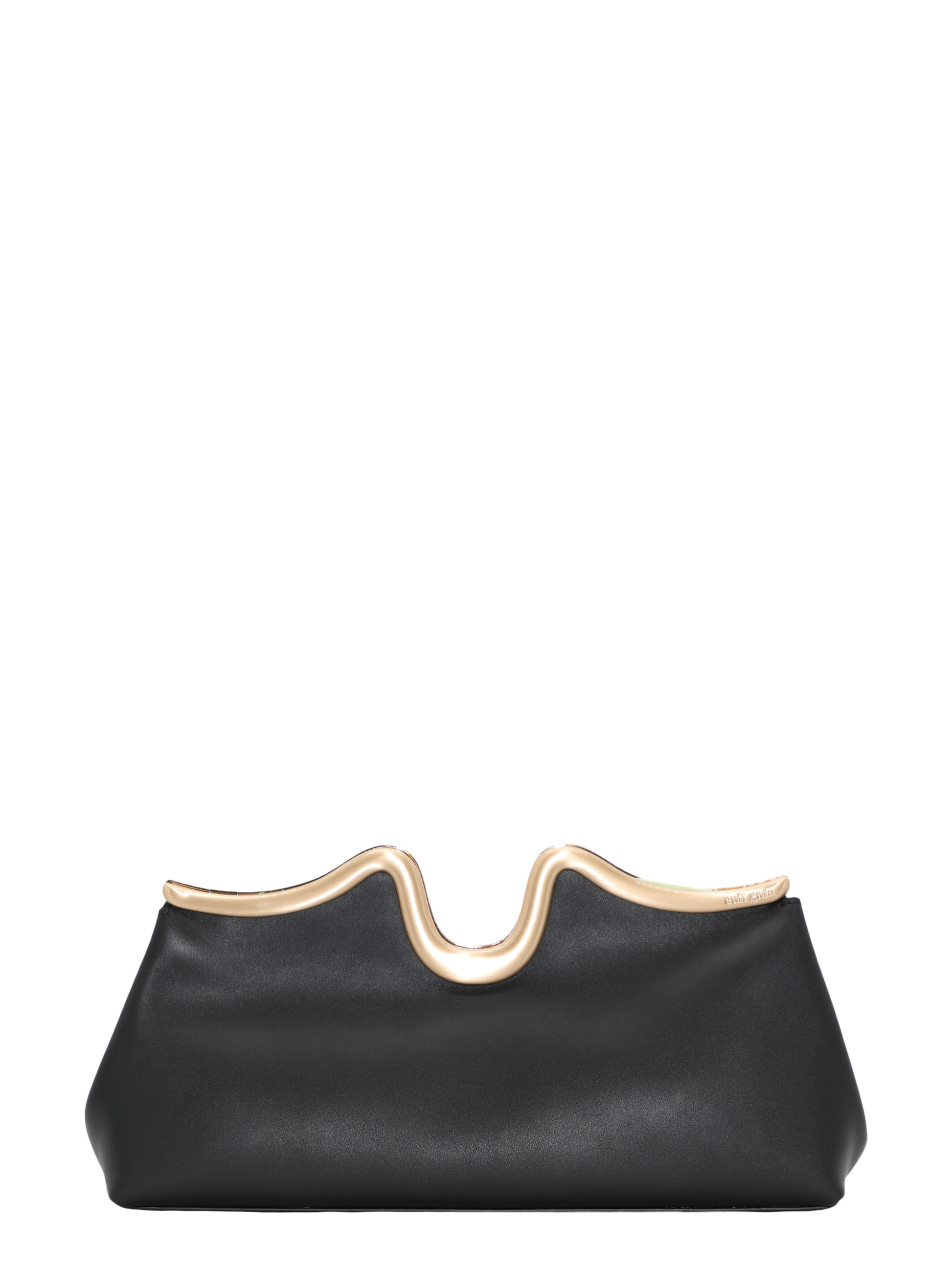 This Cult Gaia Valma clutch combines sculptural elegance with functional design. Crafted from smooth leather, it features distinctive wavy brass trim that adds a refined artistic touch. The removable chain strap offers versatile styling options, allowing you to carry it as a clutch or wear it over the shoulder. Perfect for elevating both casual and formal ensembles with a sophisticated edge.